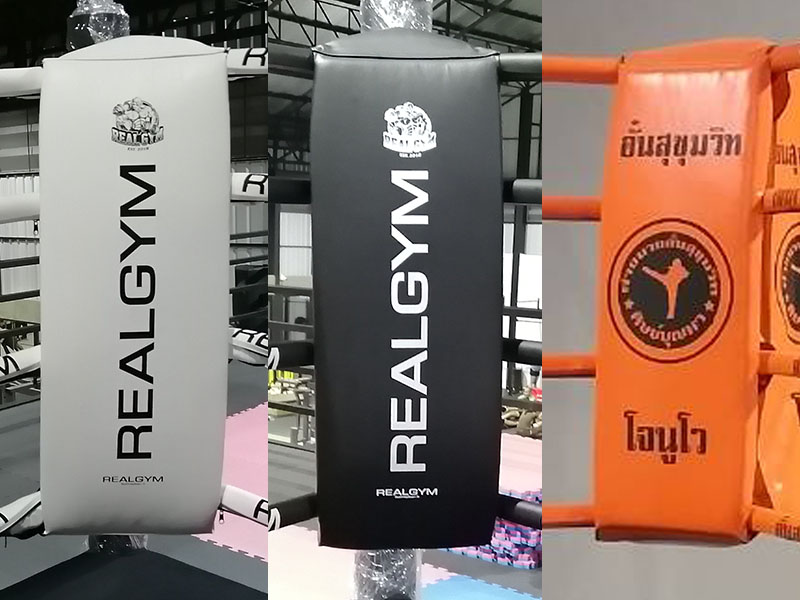Coussins de coins de ring Muay Thai en provenance de Thaïlande. Options personnalisées disponibles : ajout de noms, logo d'entreprise, logos de sponsors.